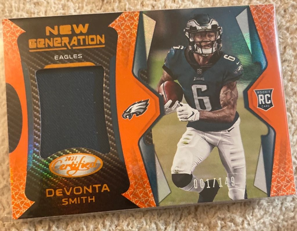 It was during my third break that I finally pulled something of value: a 2021 Panini Certified RPA, numbered 001/149, of DeVonta Smith. At the time, I was chasing the high of a “big” score, and this one satisfied that craving. When I held it in my hands, I felt proud. Like I finally had something that meant something. In a strange way, I felt like I had value too, just like the card. I think I sol